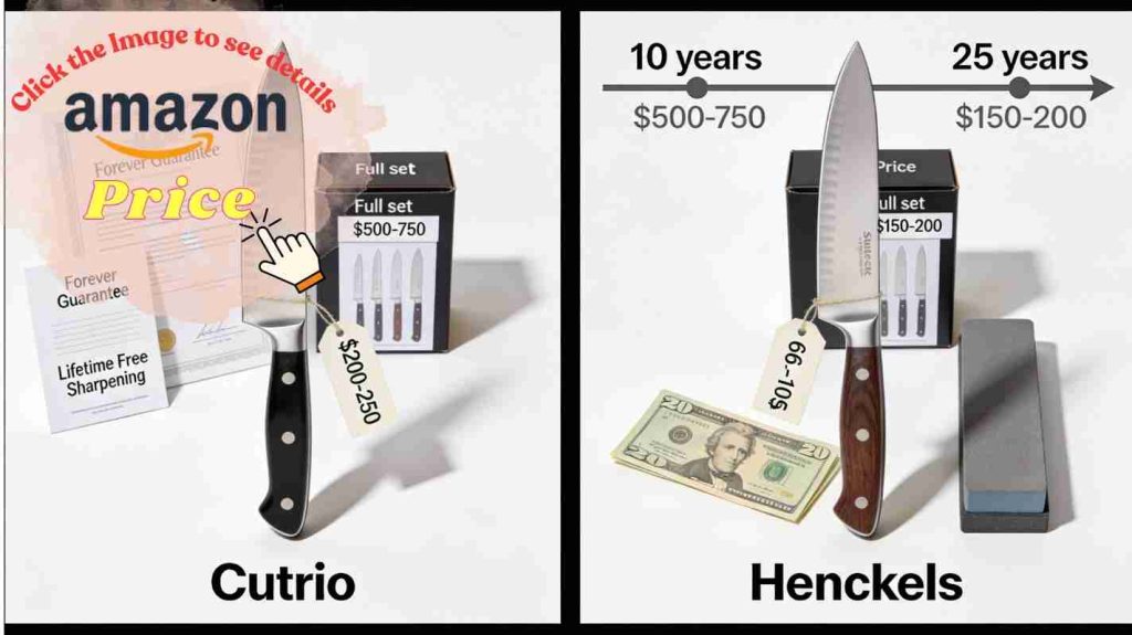 A single chef’s knife from Henckels costs between $60 and $100. This is a great price for the quality you get. On the other hand, a Cutco knife costs between $200 and $250. This means Cutco is two or three times the price. If you want a full set, Henckels is a budget choice at $150 to $200. A Cutco set can cost $500 to $750. Henckels uses very good steel, and many pros like it more than Cutco. But Cutco has a plan that adds value over time. They offer free sharpening forever if you pay for the shipping. With Henckels, you might spend $20 once for a stone to do it yourself.